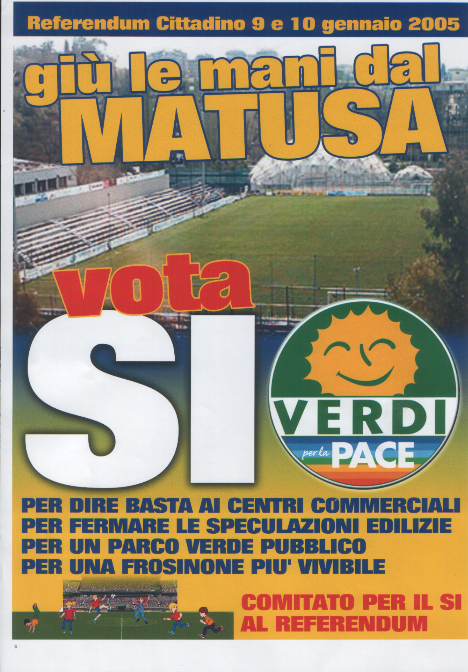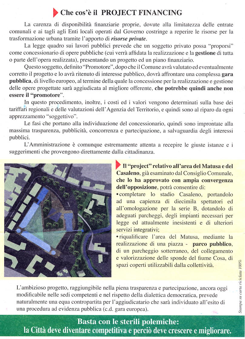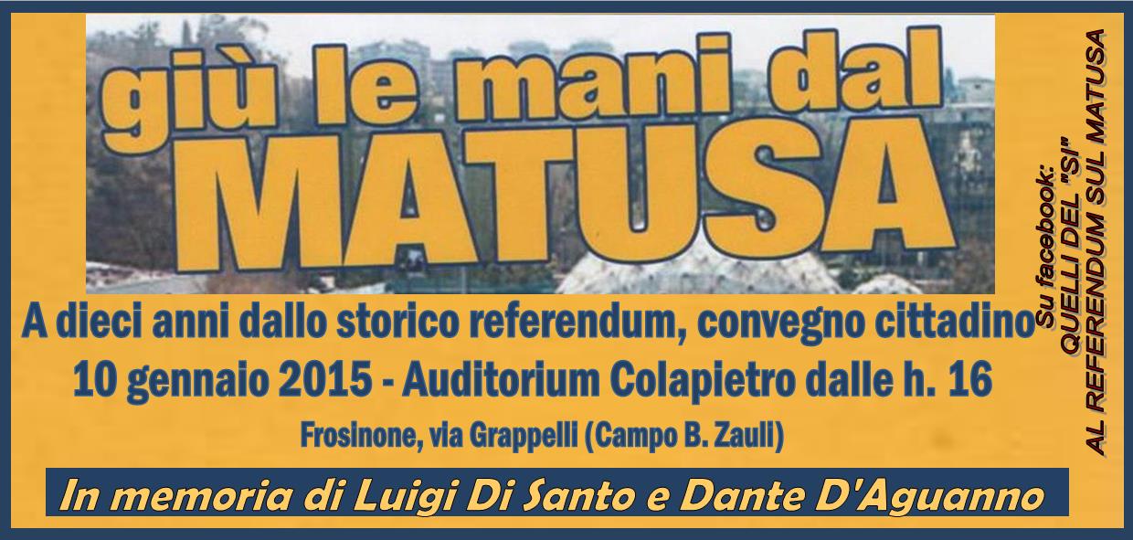 13/08/2003 Cosa cola nel Cosa? 20-set-03 La Parola al Cittadino Quale sarà il futuro del Campo Sportivo di Frosinone? 01/10/2003 Delibera Project financing 03/11/2003 Cosa ne pensano i cittadini di Frosinone in merito al futuro utilizzo del Campo Sportivo? 05/11/2003 Risultati questionari Matusa 05/11/2003 Dopo lo spoglio dei questionari il risultato non lascia dubbi c’è una vittoria nettissima di coloro che vogliono mantenere l’area dello Stadio comunale Matusa come area integralmente verde. 01/01/2004 9 RAGIONI PER VOTARE SI AL REFERNDUM 17/01/2004 Project Matusa e consulenze, fuoco di fila sul sindaco Marzi 20/01/2004 Revoca progetto sul Matusa, l'assessore Caparrelli non ci sta 18/04/2004 Richiesta di vincolo ambientale e monumentale 18/04/2004 I verdi affilano le armi 18/04/2004 Richiesta di vincolo ambientale e monumentale. 27/04/2004 Nuovo stadio, il sindaco marzi accelera 10/05/2004 Ecco lo stadio al posto del Matusa 13/05/2004 Un parco al Matusa, raccolte 250 firme 22/05/2004 Che cosa fare del Matusa? 30/05/2004 Project ora si accelera 30/05/2004 Stadio e stazione ecco le novità 30/05/2004 Il Matusa va in pensione, 32 anni dopo 02/06/2004 Project è rottura Storace-Marzi 05/06/2004 Nuovo stadio e Matusa, bufera in Consiglio tra il sindaco e i Verdi 09/06/2004 I VERDI: “ TEMIAMO UN POLVERONE POLITICO PER NASCONDERE LA VOLONTA’ DEI CITTADINI ” 10/06/2004 Contatto Storace Marzi. Scatta l'ora della pace 10/06/2004 De Santis lancia il referendum 10/06/2004 Marzi tira dritto Consiglio il 17 23/06/2004 Una maggioranza consociativa da contrastare 23/06/2004 La soluzione contrattata e di compromesso che ha messo d’accordo la quasi totalità del centrosinistra con AN e UDC sulla vicenda del Matusa-Casaleno alla fine scontenta i cittadini 06-set-04 l’ennesima crisi politica ed amministrativa 16/09/2004 20/10/2004 Ivan De Santis ospite a Radio Movida per parlare della questione stadio e referendum 29/10/2004 Il sindaco e la giunta: «Basta con l’ordinaria amministrazione, è il momento dei grandi progetti, a partire dalla svolta urbanistica» 19/11/2004 Nasce il Comitato per il Sì 22/11/2004 Il project finisce al TAR 22/12/2004 il WWF invita tutte le persone di Frosinone che conosci ad andare a votare il 9 e 10 gennaio 2005. 31/12/2004 9-10 gennaio referendum sull’area dello stadio comunale “matusa” 09/01/2005 Frosinone un referendum popolareper salvare l'area dello stadio e contro la cementificazione